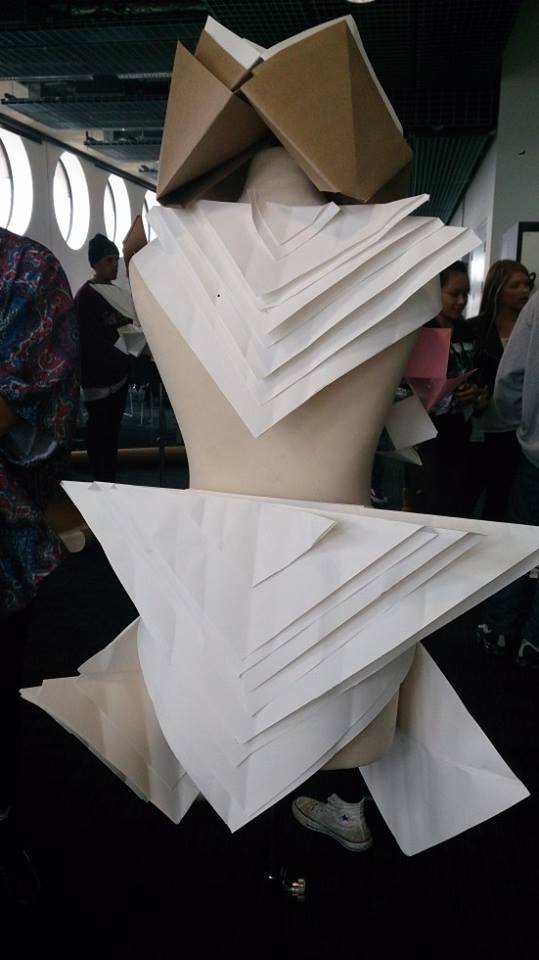 This is the first garment that another pair had made by using our materials, i really like this piece i feel that they covered the manikin well, i like how they have used the triangle as a base and then the chatter boxes as detail, and how they used the bigger chatted boxes as a head piece.