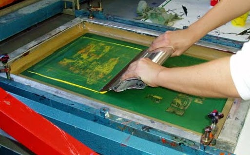 A woven mesh/silk screen is used to support an ink blocking stencil, ink is applied to the top of the screen where the stencil is, then a squeegee is used to spread the ink all over the silk screen.